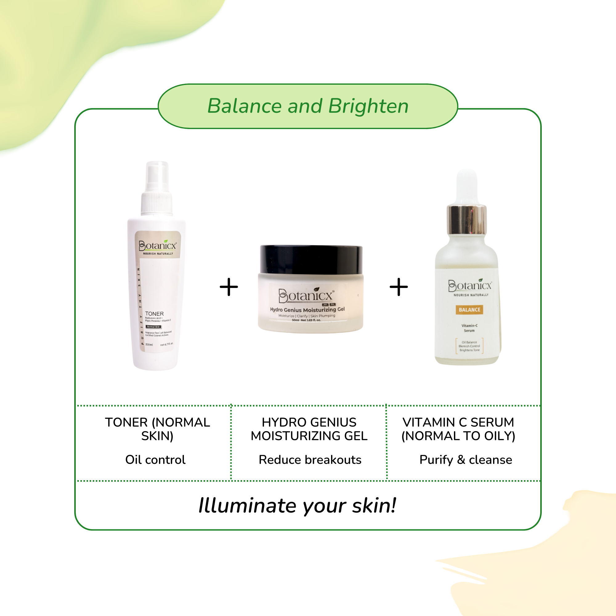 Maintain balanced, radiant skin with our Balance & Brighten bundle. This set includes Toner for Normal Skin, Hydro Genius Moisturizing Gel, and Vitamin C Serum for Oily to Normal Skin to hydrate and brighten your complexion effortlessly.