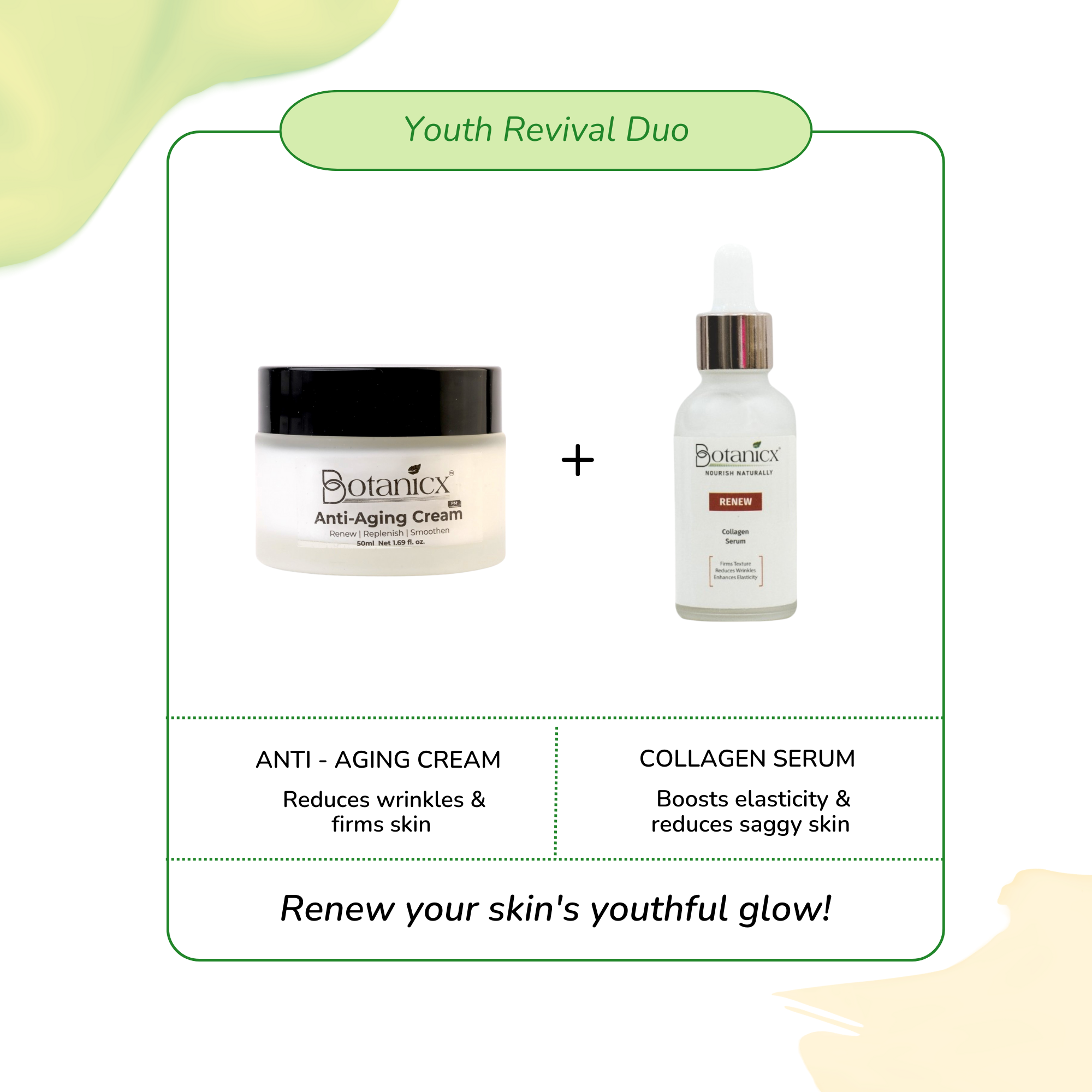 Anti-Aging Cream targets fine lines and wrinkles, while Collagen Serum boosts skin elasticity and firmness. Together, they rejuvenate and restore your skin's youthful appearance.